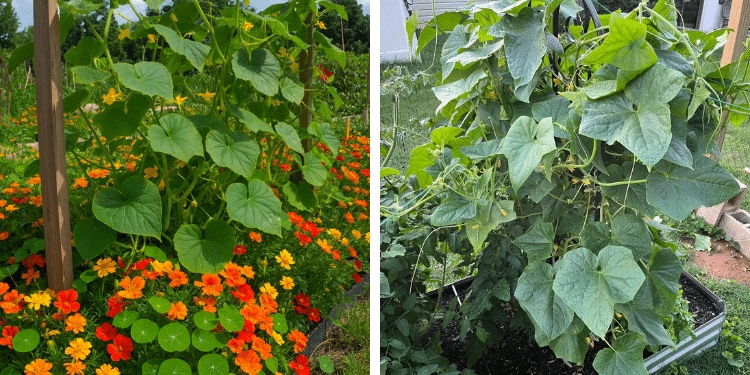 Suas folhagens extensas também ajudam a manter o solo fresco e úmido – exatamente o que os pepinos precisam.