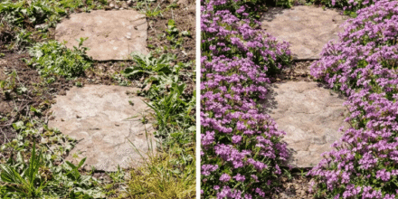 O tomilho rastejante é uma cobertura de solo baixa e aromática que forma um tapete denso e semelhante a um carpete. Suas pequenas folhas abraçam o solo tão firmemente que pouca luz atinge as sementes de ervas daninhas abaixo.