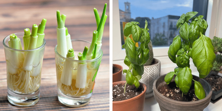 Você pode replantar cebolinhas compradas na loja colocando as extremidades brancas na água ou plantando-as diretamente em um pequeno vaso.