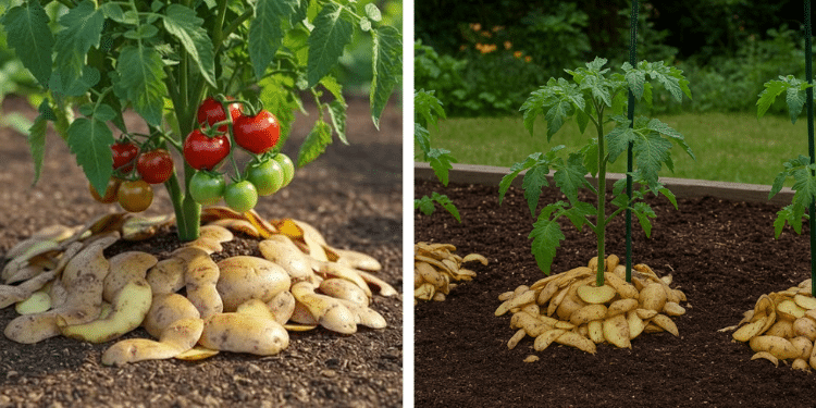 As cascas de batata ajudam os tomates a desenvolver raízes mais fortes e folhagem mais saudável, especialmente em jardins orgânicos.