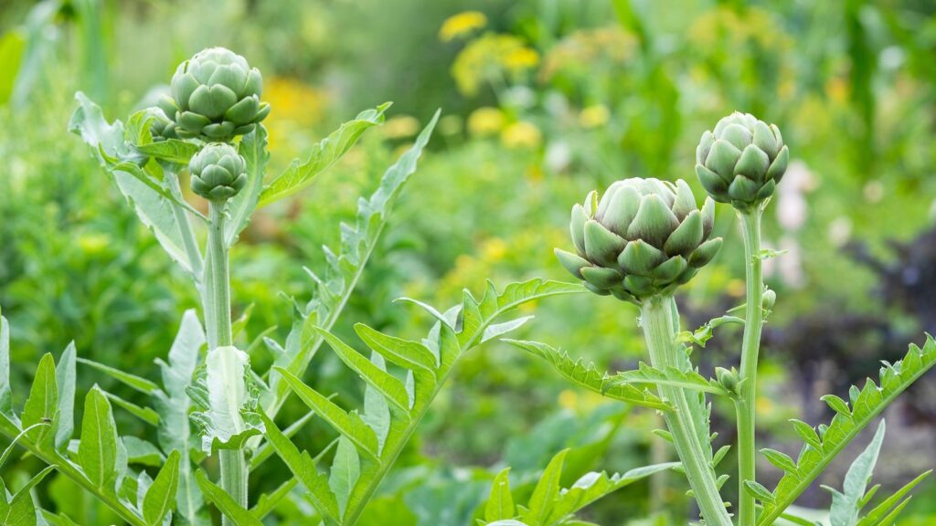 Alcachofras são vegetais de maturação longa com formas de flores únicas e folhagem verde prateada, espinhosa e semelhante a frondes. As partes comestíveis são as flores subdesenvolvidas, com tecidos internos macios e corações carnudos. As alcachofras seguem o fluxo de folhas em clima frio, com três a cinco botões por planta.