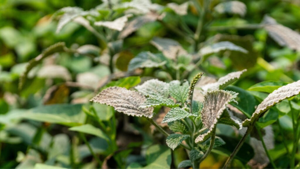 O oídio é comum ao ar livre e dentro de estufas! É uma doença fúngica incômoda que se espalha de folha para folha. Cresce um pó branco-cinza cheio de esporos nas superfícies e na parte inferior das folhas. Os esporos se espalham para outras plantas quando o vento os leva a hospedeiros adequados próximos.
